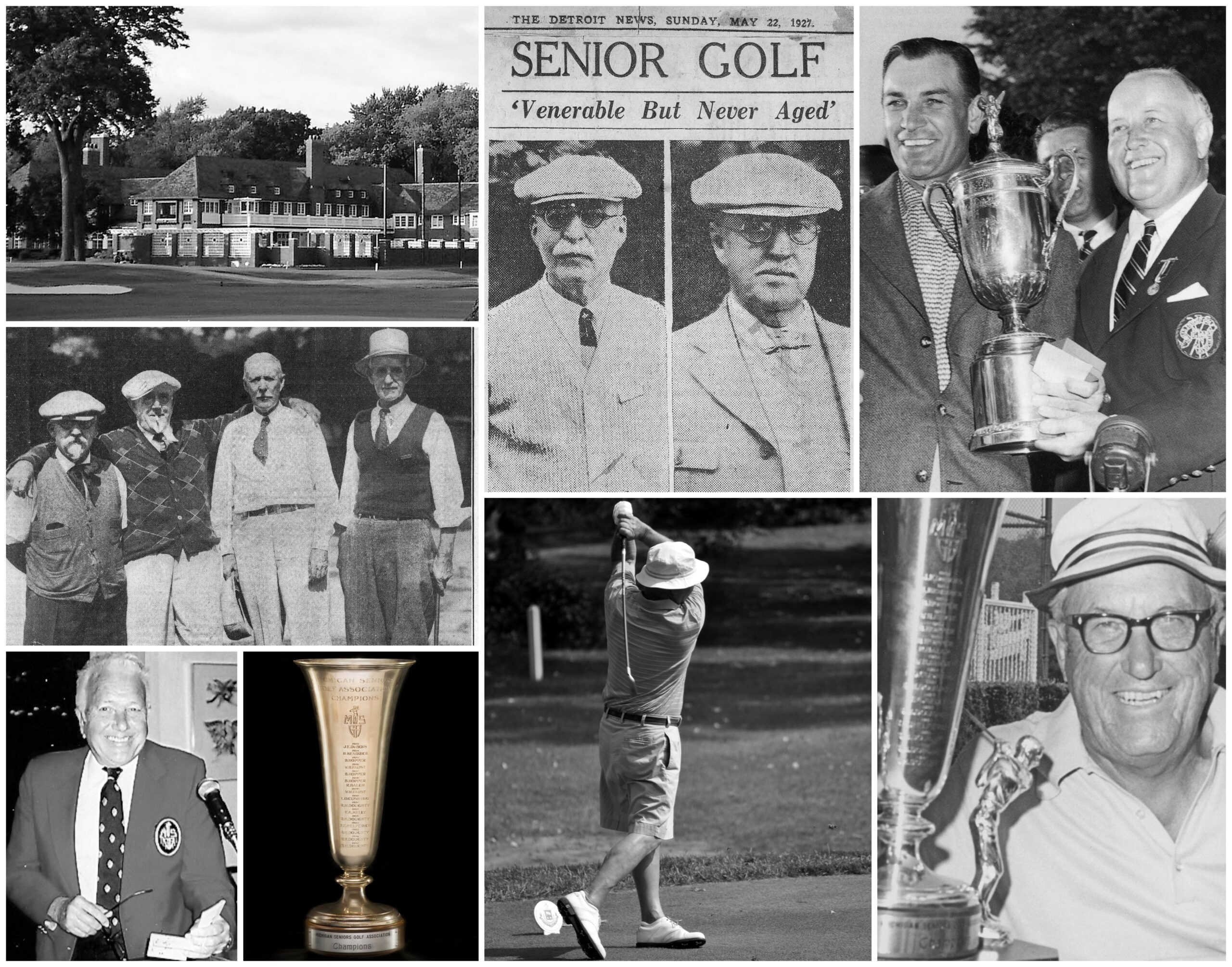 Photo identification: Jim Standish, Jr.-MSGA President in 1949-50, a four-time Michigan Amateur Champion and two-time President of the U.S. Golf Association (pictured top-right, presenting the 1951 U.S. Open trophy to Ben Hogan at Oakland Hills); Tom Draper-winner of the North-South Amateur in 1965 and the U.S. Senior Amateur in 1971 (pictured bottom-right with one of his three Michigan Seniors Championship trophies); Dick McLear- a three-time Michigan Seniors champion (bottom-center); Dr. Fritz Adams, MSGA President 1985-86 and Executive Director 1987-2001. Others unidentified.
